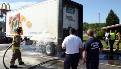 Firefighters extinguish flames caused by a tire blowout on a truck on South Illinois Avenue near Rutgers Avenue Monday morning.