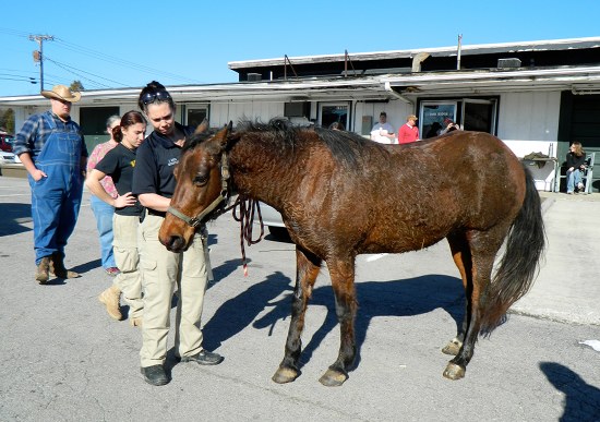 Oak Ridge Animal Shelter Supervisor Julie Armes, center, examines a quarter horse that had been stuck in a horse trailer Wednesday afternoon. Behind Armes is Animal Control Officer Sara Walter, and at left is the horse’s owner Boone Hackney of Sweetwater.