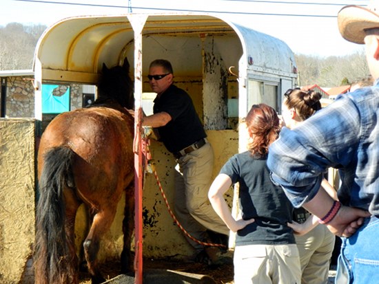 Oak Ridge firefighters and police and animal control officers rescue a horse stuck in a trailer near Oak Ridge Turnpike and Louisiana Avenue on Wednesday afternoon. Pictured above helping the horse out of the trailer is Oak Ridge Animal Control Officer Randy Proffitt.