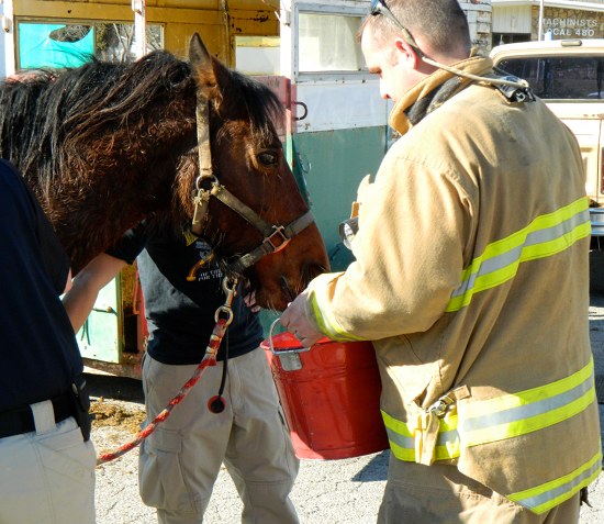 Oak Ridge Fire Department firefighter T.J. Giles gives water to a horse rescued from a trailer after its hoof became stuck near Oak Ridge Turnpike and Louisiana Avenue.