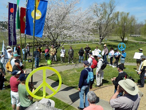 Demonstrators from the Oak Ridge Environmental Peace Alliance and supporters of the group gather at the Friendship Bell at the beginning of Saturday’s demonstration.