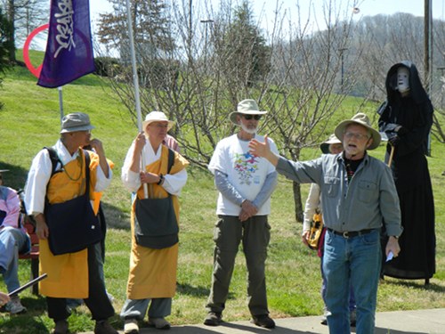 One man, Kevin Collins of South Knoxville, wore stilts and a Grim Reaper costume with a scythe. He said he envisions a world “without the threat of instant incineration and obdurate obliteration.”