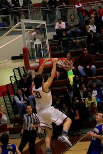 Senior forward Isaac Merian with the first of two big dunks during a Friday night win over the Karns Beavers. (Photo courtesy Bruce Phillips)