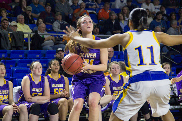 Senior Emily Griffith (11) of Oliver Springs scored 14 points, and her twin sister Rachel Griffith led all scorers with 25 as the Lady Bobcats coasted to a 67-41 win over Riverside in a state tournament quarterfinal game in Murfreesboro on Friday. Also pictured is Riverside senior Bree Linton (24) and freshman Deidre McElrath (11). (Photo by Kindell Moore)