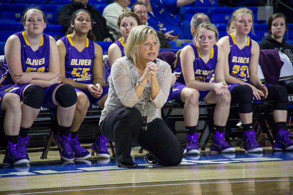 Oliver Springs Coach Michelle Christopher is pictured above with her team during the Division I Class A girls’ quarterfinal game at MTSU on Friday. (Photo by Kindell Moore)