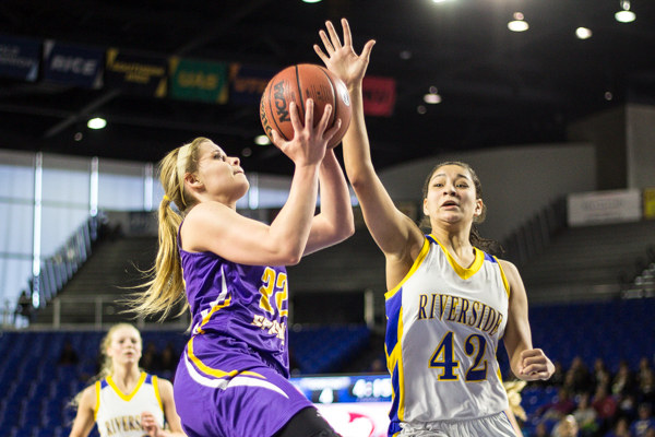 Senior guard Rachel Griffith (22) led all scorers with 25 points. Defending here is Riverside’s La’Sha Scott (42). (Photo by Kindell Moore)