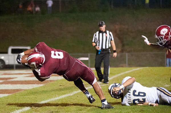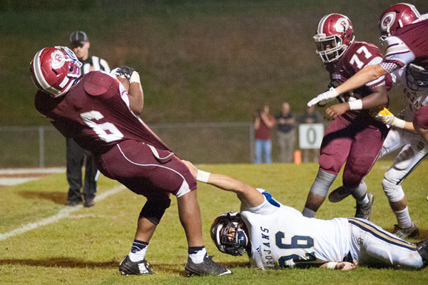 Oak Ridge senior running back T.J. Allison (6) powers into the end zone for a touchdown during a 45-33 win over Soddy Daisy in a first-round Class 5A playoff game on Blankenship Field on Thursday, Nov. 5, 2015. (Photo by Julio Culiat)