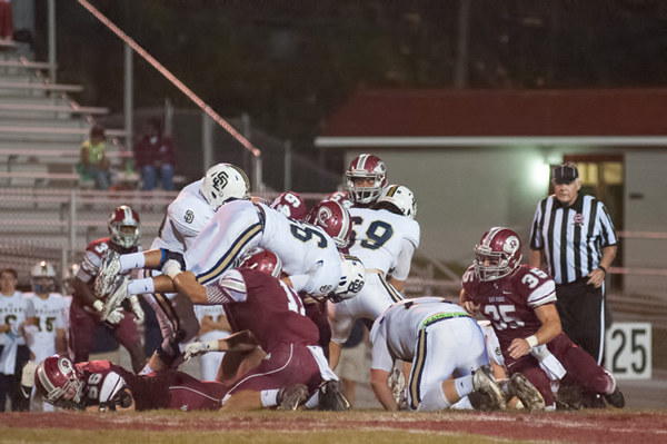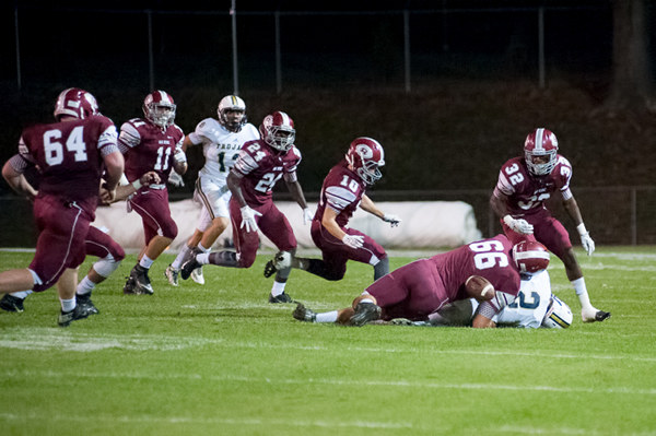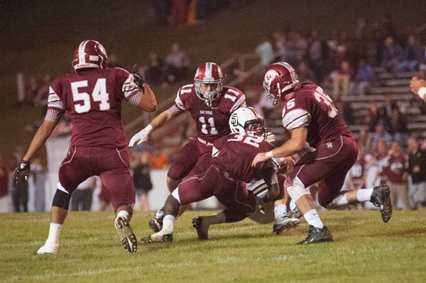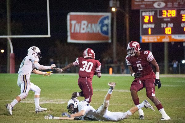 The Wildcats’ defense swarms Soddy Daisy during a a 45-33 win for Oak Ridge in a first-round Class 5A playoff game on Blankenship Field on Thursday, Nov. 5, 2015. Pictured above are junior Kyndall Clark (54), senior Gavin Warrington (11), senior Davon Middleton (32), and senior Adam Manookian (35). (Photo by Julio Culiat)