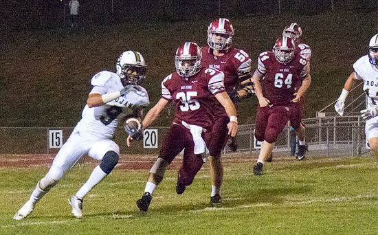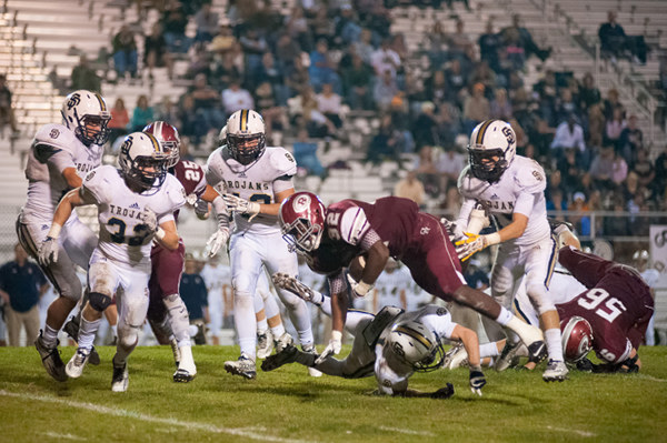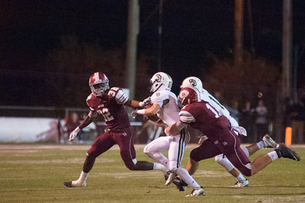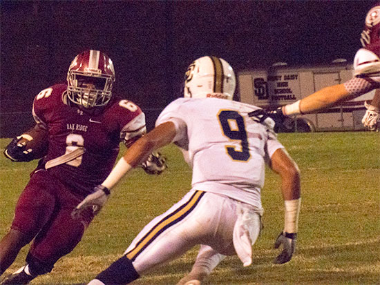 The Oak Ridge defense, which had another big night, makes another stop during a first-round Class 5A playoff game on Blankenship Field on Thursday, Nov. 5, 2015. Pictured above are seniors Davon Middleton (32) and Gavin Warrington (11). (Photo by Julio Culiat)