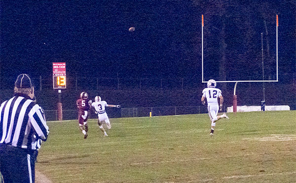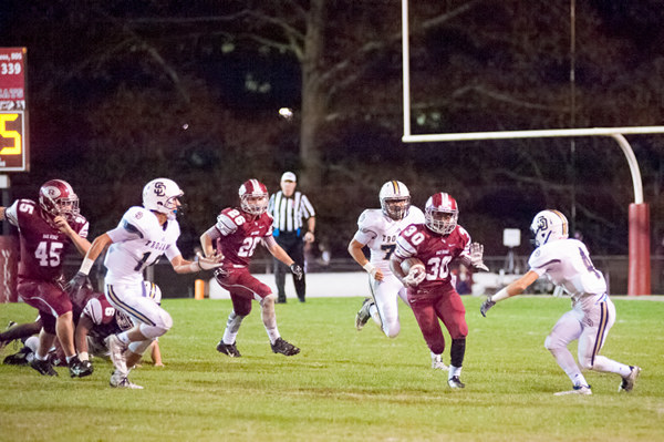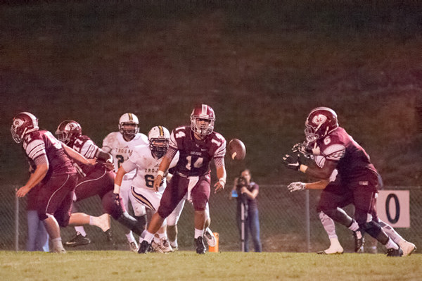 Soddy Daisy quarterback Justin Cooke (2) fumbled on the Trojans’ second drive, and Oak Ridge junior Chase Kimbro (10) recovered it during a 45-33 win for the Wildcats in a first-round Class 5A playoff game on Blankenship Field on Thursday, Nov. 5, 2015. Making the tackle above is Oak Ridge senior Alex Alcorn (66). (Photo by Julio Culiat)