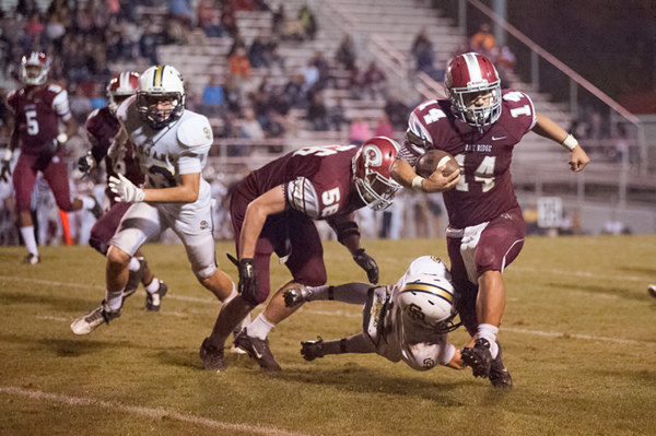 Oak Ridge senior quarterback Jordan Dunbar (14) ran 11 yards for a touchdown midway through the second quarter of a 45-33 win over Soddy Daisy in a Class 5A football playoff game on Blankenship Field on Thursday, Nov. 5, 2015. (Photo by Julio Culiat)