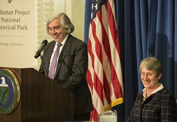 Secretary of the Interior Sally Jewell and Energy Secretary Ernest Moniz shortly after they signed a memorandum of agreement and created the 409th park in the National Park System, the Manhattan Project National Historical Park. The park was authorized by Congress in December 2014. The park will have three sites in Los Alamos, New Mexico; Hanford, Washington; and Oak Ridge, Tennessee. The ceremony took place at the South Interior Building in Washington, D.C., on November 10, 2015. (NPS Photo by Anthony DeYoung)