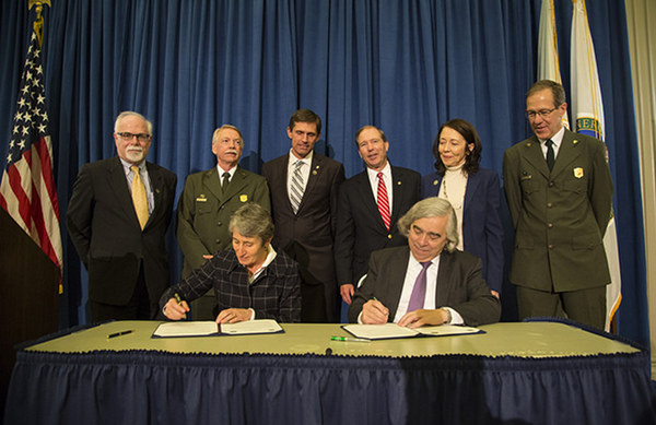Secretary of the Interior Sally Jewell and Energy Secretary Ernest Moniz sign a memorandum of agreement to create the 409th park in the National Park System, the Manhattan Project National Historical Park. The ceremony took place at the South Interior Building in Washington, D.C., on November 10, 2015. The park was authorized by Congress in December 2014. The park will have three sites in Hanford, Washington; Oak Ridge, Tennessee; and Los Alamos, New Mexico. (NPS Photo by Anthony DeYoung)