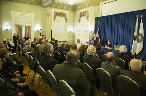 Energy Secretary Ernest Moniz addresses a gathering of park supporters and the news media at the South Interior Building in downtown Washington, D.C., on November 10, 2015. Moniz and Secretary of the Interior Sally Jewell, seated at the table, signed a memorandum of agreement which created the 409th park in the National Park System, the Manhattan Project National Historical Park. The park was authorized by Congress in December 2014. It will have three sites in Hanford, Washington; Oak Ridge, Tennessee; and Los Alamos, New Mexico. (NPS Photo by Anthony DeYoung)