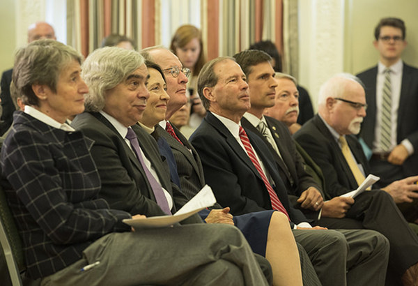 From left to right, Secretary of the Interior Sally Jewell; Energy Secretary Ernest Moniz; U.S. Sen. Maria Cantwell, Washington; U.S. Senator Lamar Alexander, Tennessee; U.S. Senator Tom Udall, New Mexico; U.S. Senator Martin Heinrich, New Mexico; National Park Service Director Jonathan B. Jarvis; and David Klauss, Department of Energy deputy undersecretary for management and performance, joined about 100 park supporters and the news media at the South Interior Building in downtown Washington, D.C., on November 10, 2015. Jewell and Moniz, signed a memorandum of agreement which created the 409th park in the National Park System, the Manhattan Project National Historical Park. The park was authorized by Congress in December 2014. It will have three sites in Hanford, Washington; Oak Ridge, Tennessee; and Los Alamos, New Mexico. (NPS Photo by Anthony DeYoung)