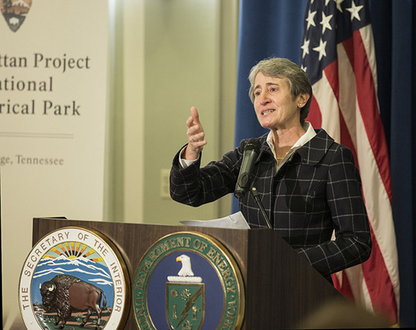 Secretary of the Interior Sally Jewell addresses a gathering of park supporters and the news media at the South Interior Building in downtown Washington, D.C., on November 10, 2015. Jewell and Energy Secretary Ernest Moniz signed a memorandum of agreement which created the 409th park in the National Park System, the Manhattan Project National Historical Park. The park was authorized by Congress in December 2014. It will have three sites in Hanford, Washington; Oak Ridge, Tennessee; and Los Alamos, New Mexico. (NPS Photo by Anthony DeYoung)