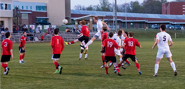 Oak Ridge freshman Will Dallas (23) and Halls freshman Hayden Sobas (23) go for the soccer ball during a 3-1 win for the Wildcats on Thursday, April 7, 2016. (Photo by John Huotari/Oak Ridge Today)