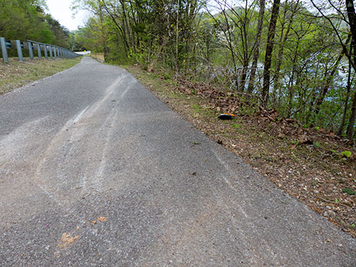 A Ford van that had crashed alongside Melton Lake Drive plunged down a steep hillside and into the Clinch River after a tow cable snapped Wednesday night, April 13, 2016, authorities said. The area of the crash is pictured above on Thursday morning. The crash site appeared to be where the tracks pictured above end in the trees. (Photo by John Huotari/Oak Ridge Today)