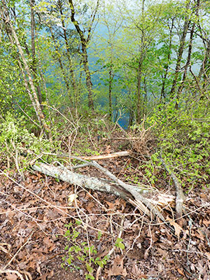 A van that crashed alongside Melton Lake Drive on Wednesday night, April 13, 2016, rolled down this embankment, estimated at about 100 feet, after a tow cable snapped. The driver was not inside the van at the time. The slope is so steep that you can’t see the bottom from the top. There are small broken trees near the apparent crash site, and debris, apparently from the crash, to the left of the picture. (Photo by John Huotari/Oak Ridge Today)