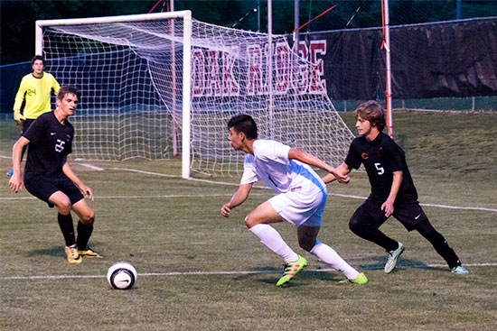Oak Ridge junior forward Austin Vinyard (9) tries to keep the soccer ball away from Clinton during a 3-0 win over the Dragons at home on Friday, April 29, 2016. (Photo by John Huotari/Oak Ridge Today)