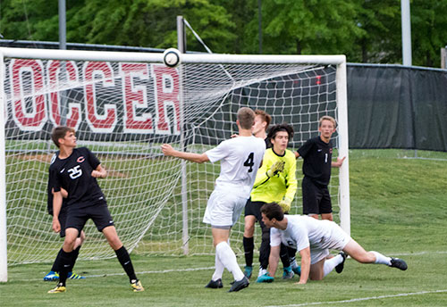 A header by Oak Ridge junior Dean Stetzel (4) appears to hit the crossbar during a 3-0 win over Clinton at home on Friday, April 29, 2016. (Photo by John Huotari/Oak Ridge Today)