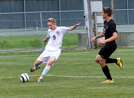 Oak Ridge junior forward Austin Vinyard (9) kicks the ball during a 3-0 win over Clinton at home on Friday, April 29, 2016. (Photo by John Huotari/Oak Ridge Today)