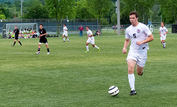 Oak Ridge senior Matt Warmbrod (5), who scored two goals, dribbles upfield during a 3-0 win over Clinton at home on Friday, April 29, 2016. (Photo by John Huotari/Oak Ridge Today)