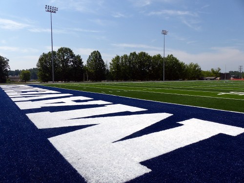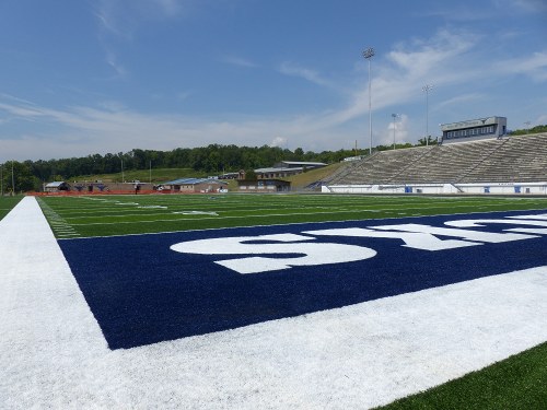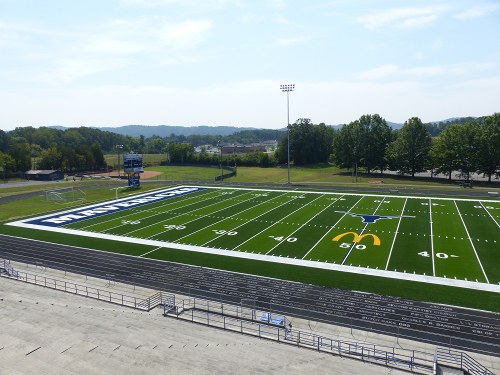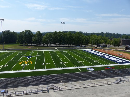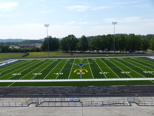 The synthetic turf field has been installed at Anderson County Mavericks football stadium, and the new field is pictured above on Friday, July 22, 2016. (Photo by John Huotari/Oak Ridge Today)