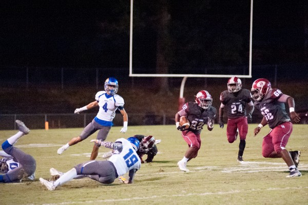 Oak Ridge sophomore running back Tre Jackson (6) led Oak Ridge in rushing with 79 yards on 12 carries and two touchdowns during a 56-6 win over Karns on Senior Night on Blankenship Field on Friday, Sept. 30, 2016. (Photo by Julio Culiat)