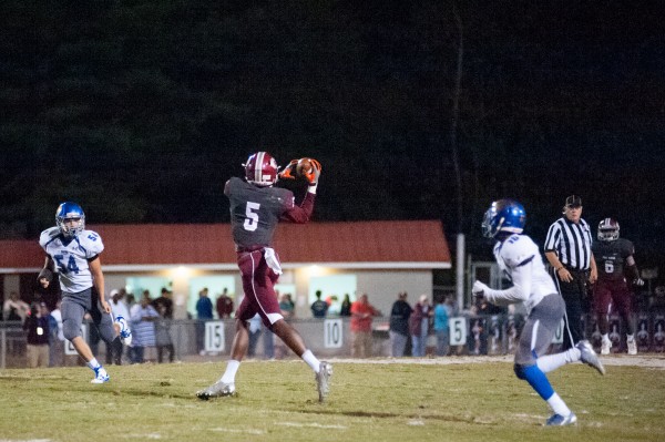 Angling across the middle of the football field, Oak Ridge senior wide receiver Tee Higgins (5) makes a catch at the end of the first half of a 56-6 win over Karns on Senior Night on Blankenship Field on Friday, Sept. 30, 2016. (Photo by Julio Culiat)