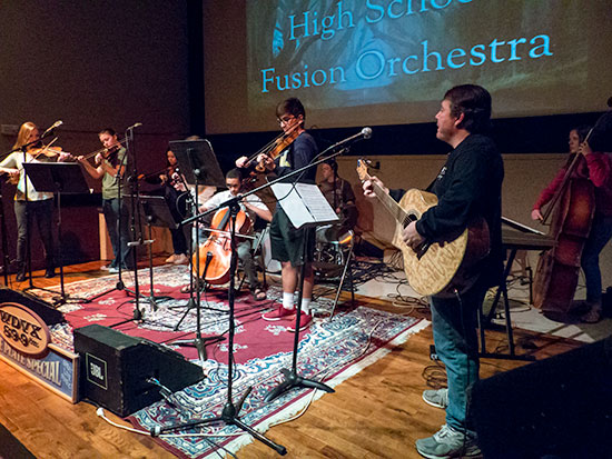 The Oak Ridge High School Fusion Orchestra performs on the “Blue Plate Special” on WDVX 89.9 FM at the Grove Theater in Oak Ridge on Friday, Feb. 3, 2017. (Photo by John Huotari/Oak Ridge Today)