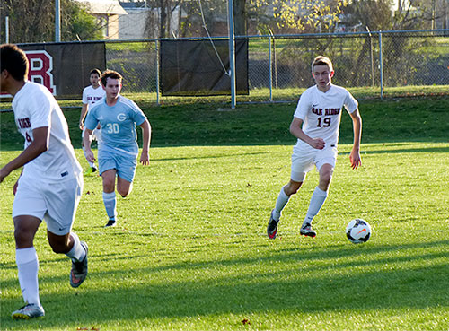 Nathan Kidder (19) of Oak Ridge looks for a pass during a 5-0 win over Gibbs at the Oak Ridge Soccer Complex on Tuesday, April 4, 2017. (Photo by John Huotari/Oak Ridge Today)