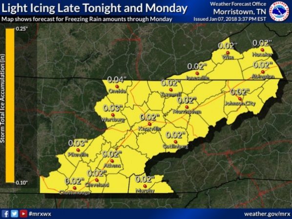 Light ice accumulations are possible late tonight and into Monday, Jan. 8, 2018. The main problems are expected to be patches of ice on roads. During the day Monday, temperatures will warm, and the precipitation should eventually turn to all rain. (Image courtesy National Weather Service in Morristown)