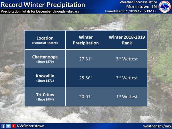It’s been the third wettest winter in Knoxville, with 25.56 inches of precipitation, and in Chattanooga, with 27.31 inches.