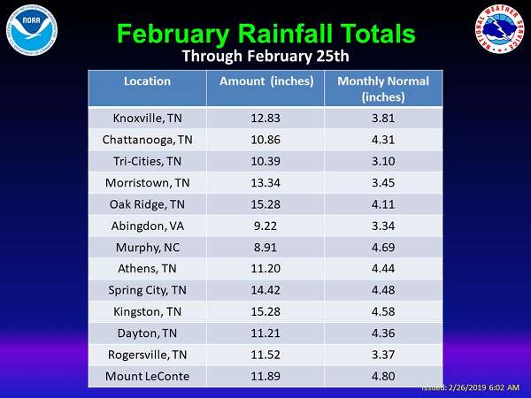 The NWS said it was the wettest February on record for Knoxville (13.08 inches of precipitation) and the Tri-Cities in upper East Tennessee (10.47 inches), and the second-wettest for Chattanooga (11.31 inches).