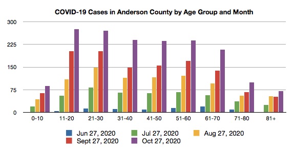 As of Tuesday, Anderson County had reported 276 COVID-19 cases among patients 11-20 years old. In the 21-30 age group, 271 cases had been reported. That was a total of 547 cases in those two age groups and roughly 32 percent of the 1,727 total cases reported in the county as of Tuesday.