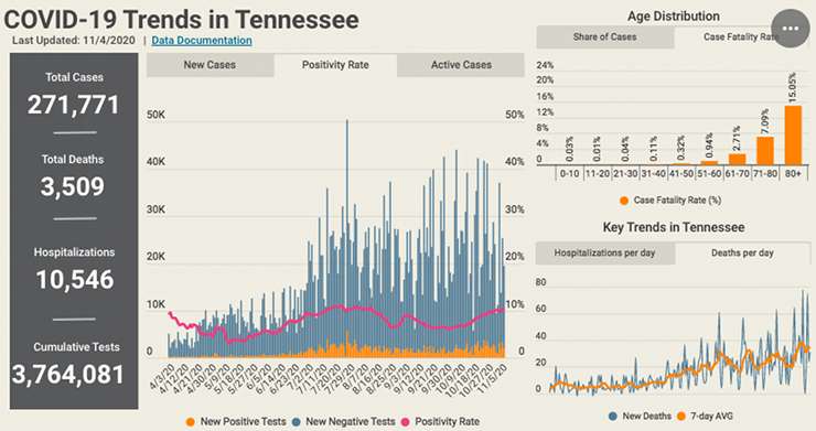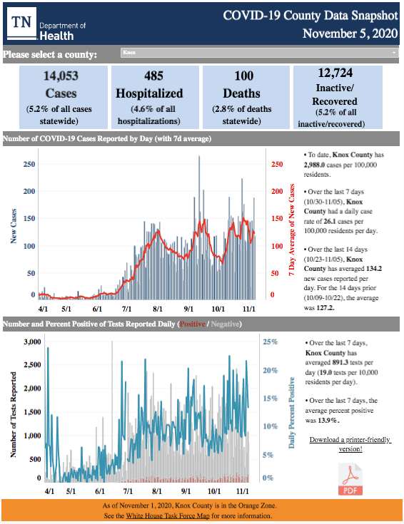 In neighboring Knox County, there have been 14,053 COVID-19 cases reported, according to the Tennessee Department of Health, with 100 deaths and 485 hospitalizations. The 14-day case average is 134.2 new cases per day, which is also up from the previous two weeks. The positivity rate has averaged 13.9 percent during the past seven days.