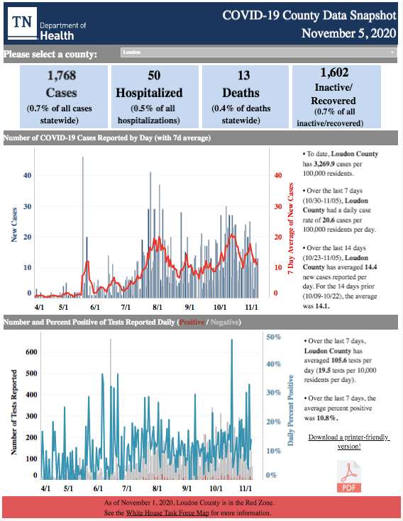 To the south, Loudon County has had 1,768 cases, with 50 hospitalizations and 13 deaths. The positivity rate has averaged 10.8 percent.