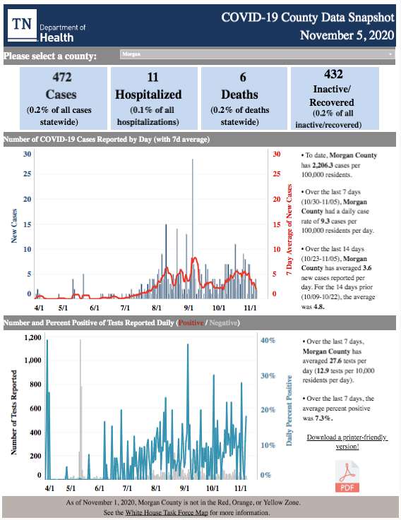 As previously reported on Oak Ridge Today, Anderson County has reported a total of 1,959 COVID-19 cases since the pandemic began March 20, with 53 total hospitalizations and 18 deaths, according to the Tennessee Department of Health. The number of inactive cases was reported at 1,658. On Thursday, the seven-day positivity average was 12.6 percent.