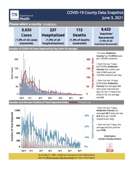 Filed Under: COVID-19, Front Page News, Health, Top Stories Tagged With: Anderson County, COVID-19, COVID-19 cases, positivity rate, Tennessee Department of Health