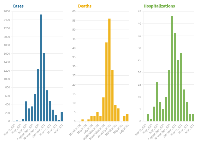 There were four deaths due to COVID-19 in Anderson County in July and three hospitalizations. There were three deaths and three hospitalizations in June, and zero deaths and eight hospitalizations in May.