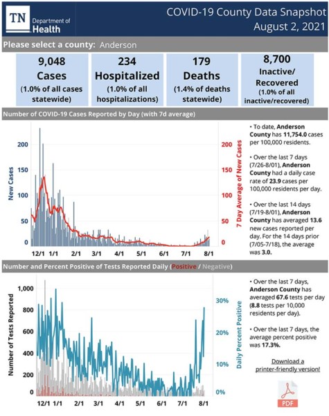 On Sunday, the seven-day average of new cases in Anderson County was 18.4, according to the Tennessee Department of Health. That was up from 13.1 on Wednesday, four days earlier. The low point was a seven-day average of 0.4 new cases per day reported July 6.