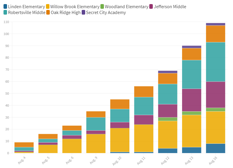 Monday morning, there were more than 200 students who were restricted from attending school. There were 109 cases of COVID among students and staff members on Monday evening, mostly among students. The largest number of COVID-19 cases is now at Robertsville Middle School. Until Friday, it had been at Willow Brook Elementary School.