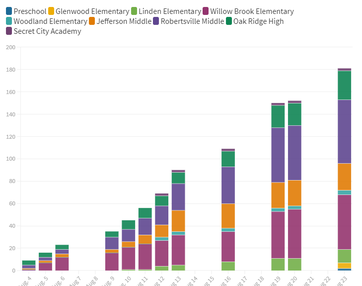 This graph shows the total number of COVID-19 cases in Oak Ridge Schools between Wednesday, Aug. 4, and Monday, Aug. 23, 2021. In less than three weeks, the number of cases increased from nine to 181. Total cases include both current cases and recovered, and they include both student and staff cases. Gaps in the graph above are days when Oak Ridge Schools didn’t publish data on weekends or when Oak Ridge Today didn’t collect the data. (Data from Oak Ridge Schools/Chart by Oak Ridge Today using Flourish)